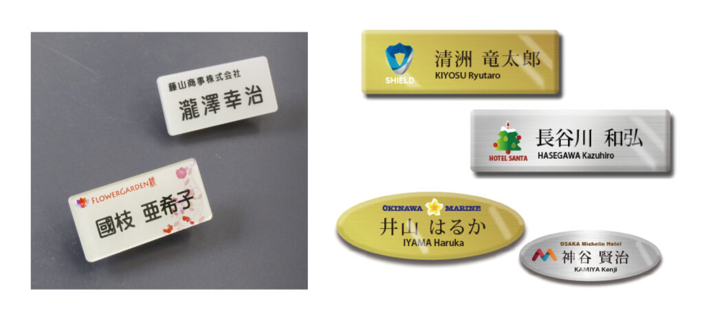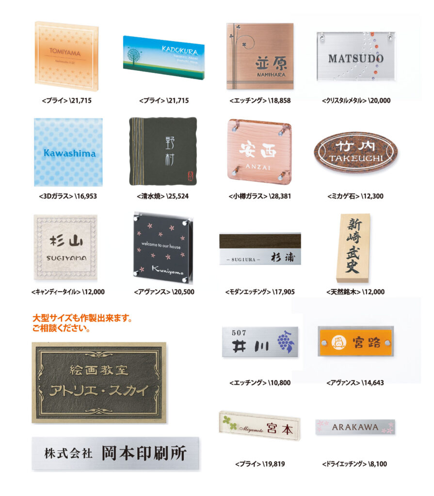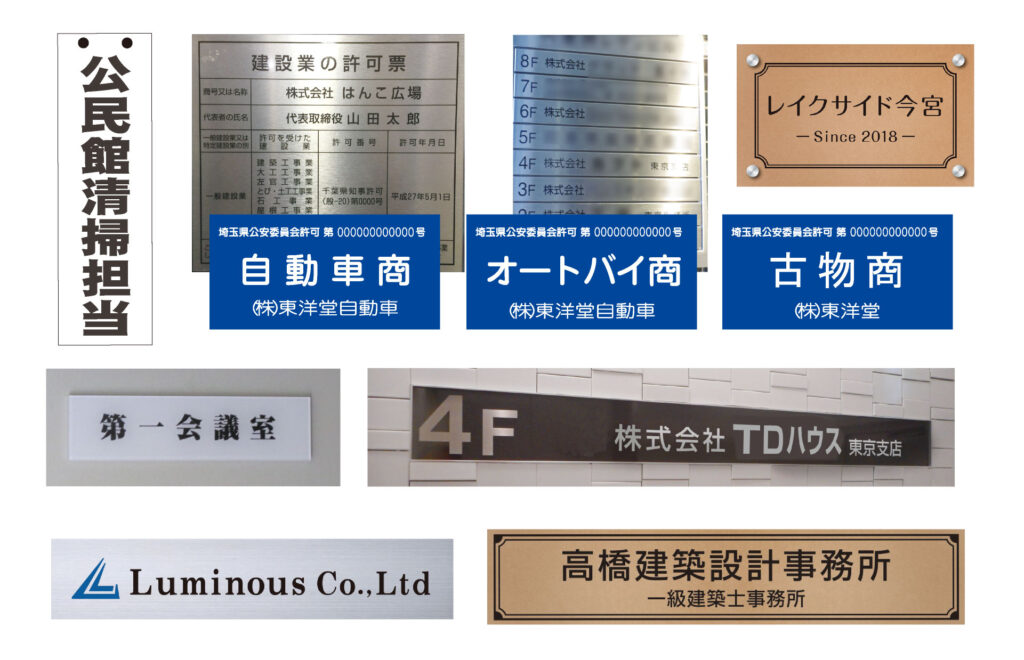 会社用の銘板など、プラスチックからメタル品質まで