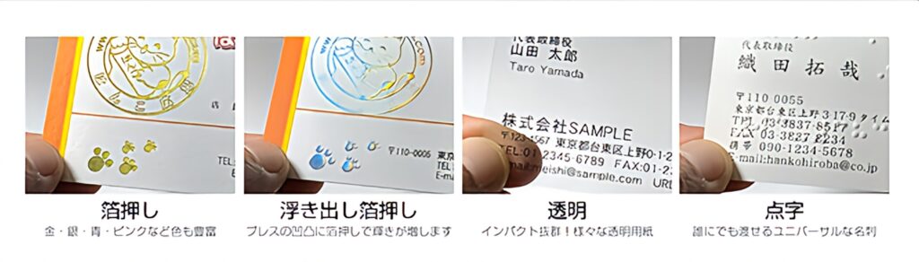 高級手漉き和紙名刺、切り抜き名刺、点字名刺など様々なオプションをご用意しています。お気軽にご相談ください。